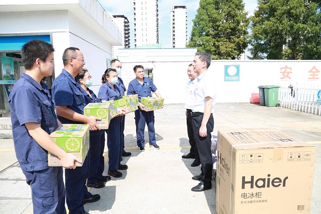 為切實(shí)做好夏季防暑降溫工作,保障高溫期間全體職工的身體健康,確保生產(chǎn)經(jīng)營工作順利進(jìn)行,8月11日下午,安慶港華常務(wù)副總楊善俊、工會(huì)主席韓高中一行來到港華路加氣站、雙井街路段戶內(nèi)管外移作業(yè)現(xiàn)場及北部新城調(diào)峰站等處,看望慰問高溫下始終堅(jiān)守在一線崗位的燃?xì)夤ぷ髡?,并送去冷柜、飲用水和防暑降溫用品,把公司的關(guān)懷送到職工們的心坎里。
