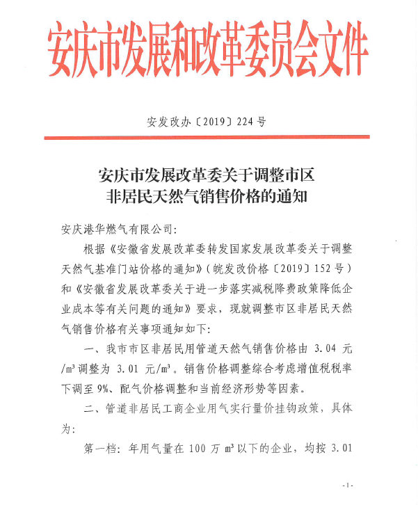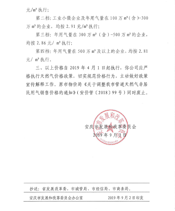 安慶市發(fā)展改革委關(guān)于調(diào)整市區(qū)非居民天然氣銷售價格的通知(2019)