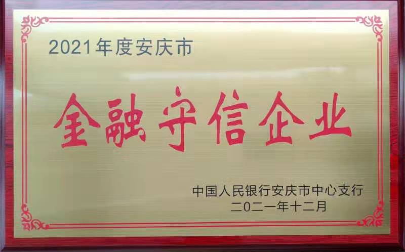 “金融守信企業(yè)”稱號系根據(jù)《安慶市金融守信企業(yè)評定實施辦法》,經(jīng)市中級人民法院、市住建委、稅務(wù)局、工商質(zhì)監(jiān)局、環(huán)保局、公管局等部門評議,并由安慶市銀行行長聯(lián)席會議評定授予。