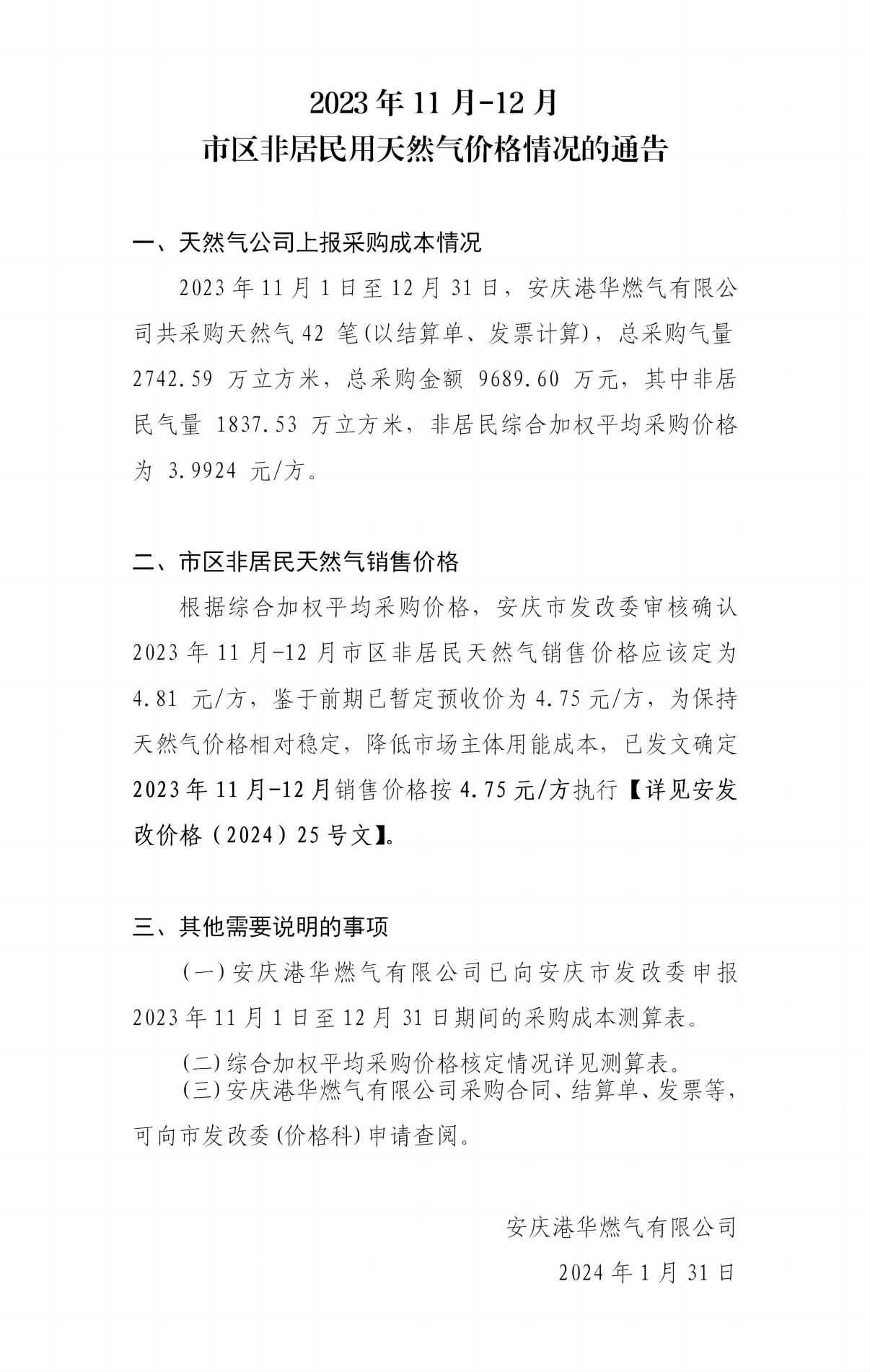 2023年11月-12月市區(qū)非居民用天然氣價(jià)格情況的通告