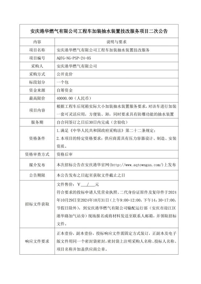 安慶港華燃氣有限公司工程車加裝抽水裝置技改服務項目二次公告