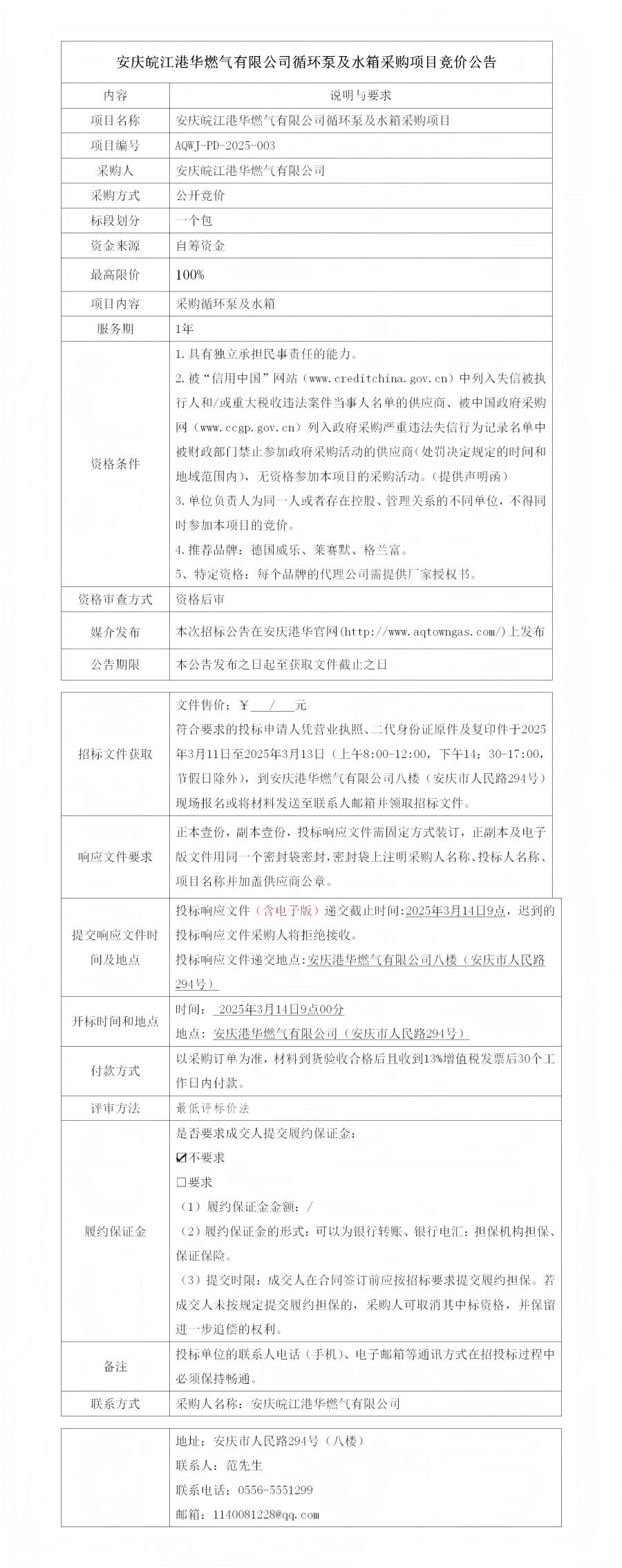 安慶皖江港華燃氣有限公司循環(huán)泵及水箱采購項目競價公告