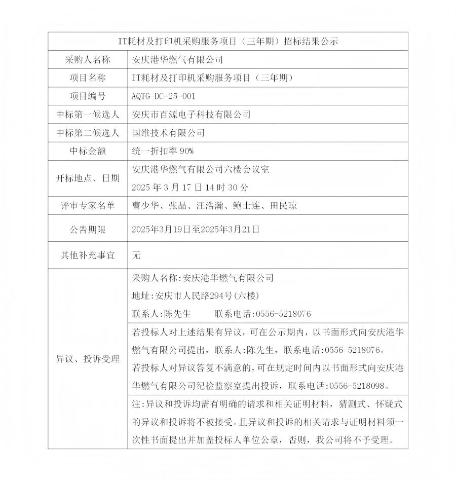 IT耗材及打印機采購服務項目(三年期)招標結果公示