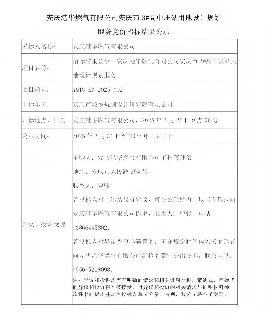 安慶港華燃?xì)庥邢薰景矐c市3#高中壓站用地設(shè)計規(guī)劃服務(wù)競價招標(biāo)結(jié)果公示