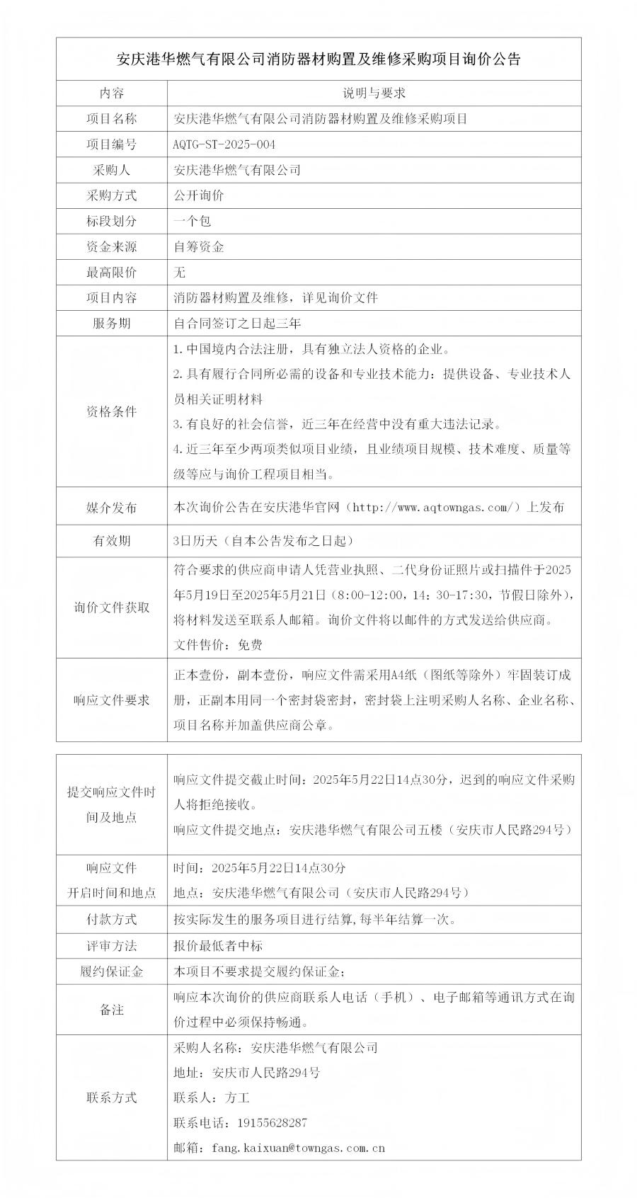 安慶港華燃?xì)庥邢薰鞠榔鞑馁徶眉熬S修采購項目詢價公告