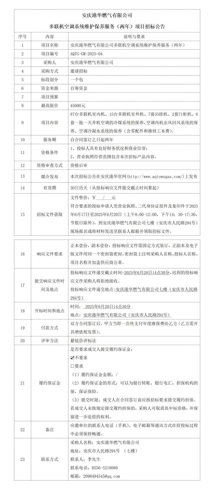 安慶港華燃氣有限公司多聯(lián)機空調(diào)系統(tǒng)維護保養(yǎng)服務(wù)(兩年)項目招標(biāo)公告