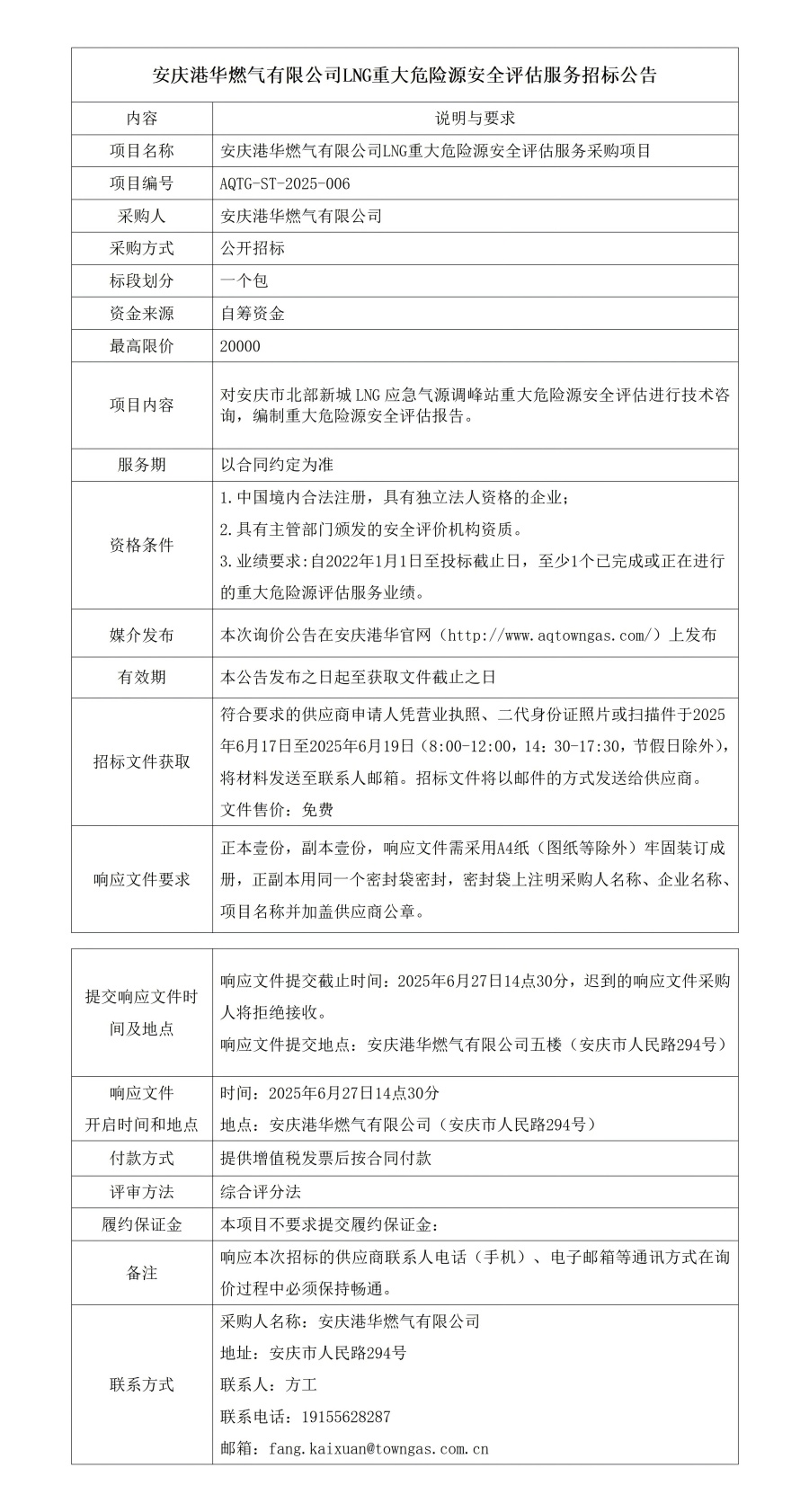 安慶港華燃?xì)庥邢薰綥NG重大危險(xiǎn)源安全評估服務(wù)招標(biāo)公告