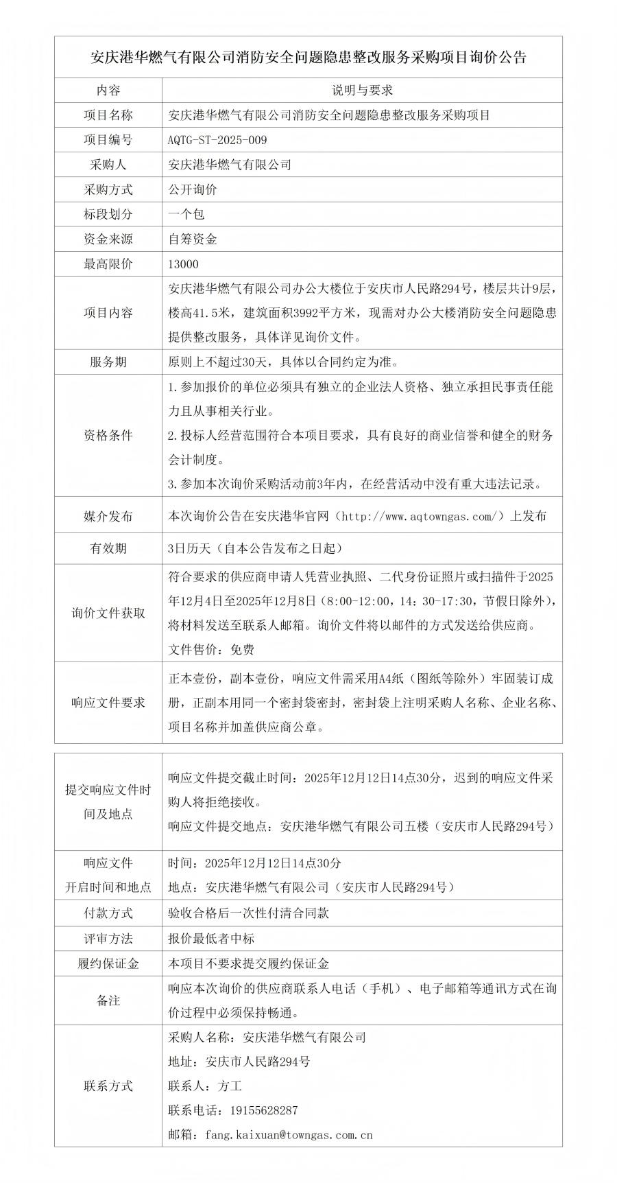 安慶港華燃氣有限公司消防安全問題隱患整改服務采購項目詢價公告
