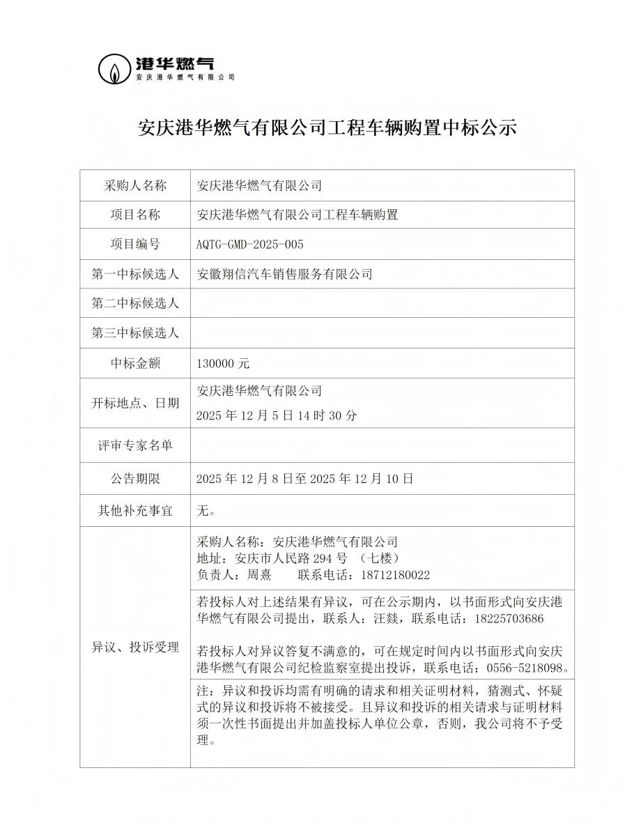 安慶港華燃氣有限公司工程車輛購置中標公示