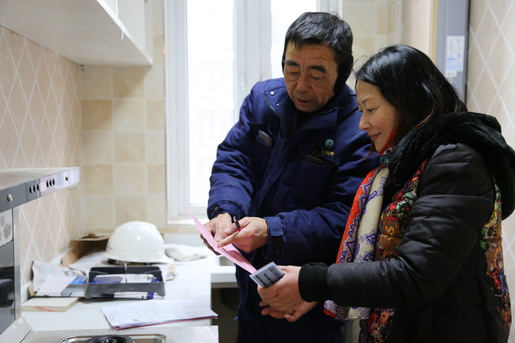 圖為客服維修人員冒著大雪為客戶提供維修服務(wù),并指導客戶安全用氣。